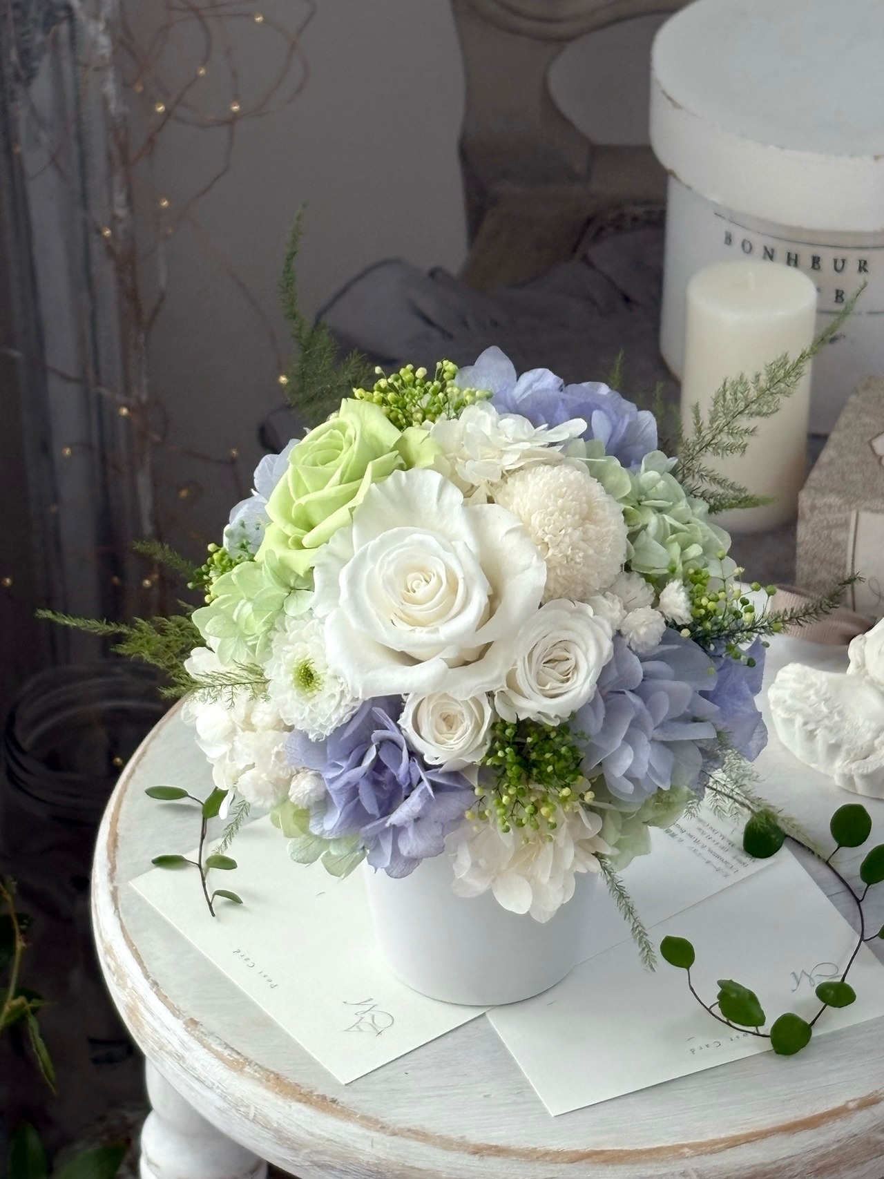 お供えアレンジメント/プリザーブドフラワー/ホワイトブルー/お供え花/お悔やみのお花/お供えアレンジメント/一周忌/三回忌/男性へのお供え花/ペットのお供え花/ラッピング無料【お届け日指定可能】【沖縄県・離島へのお届け不可】