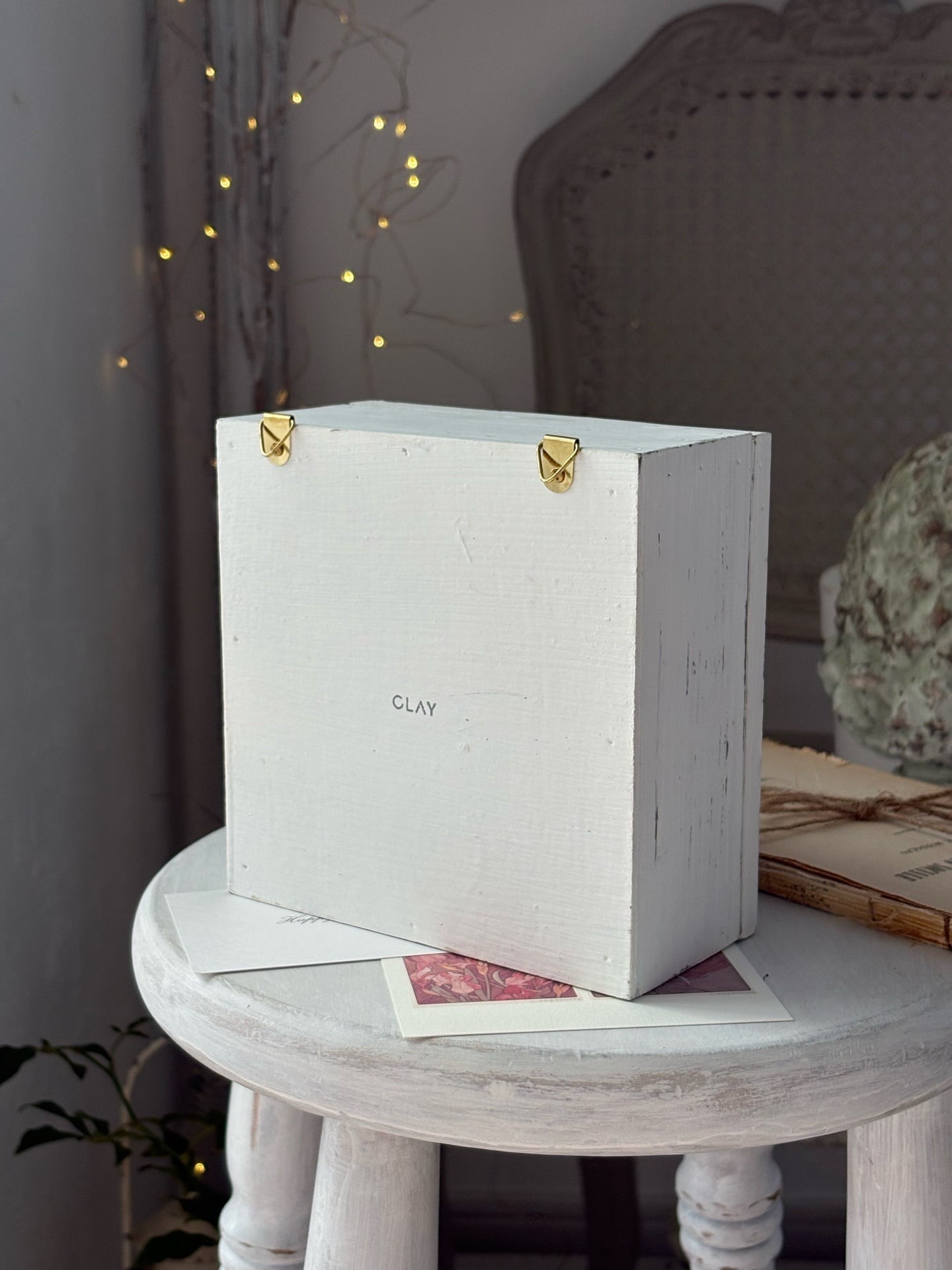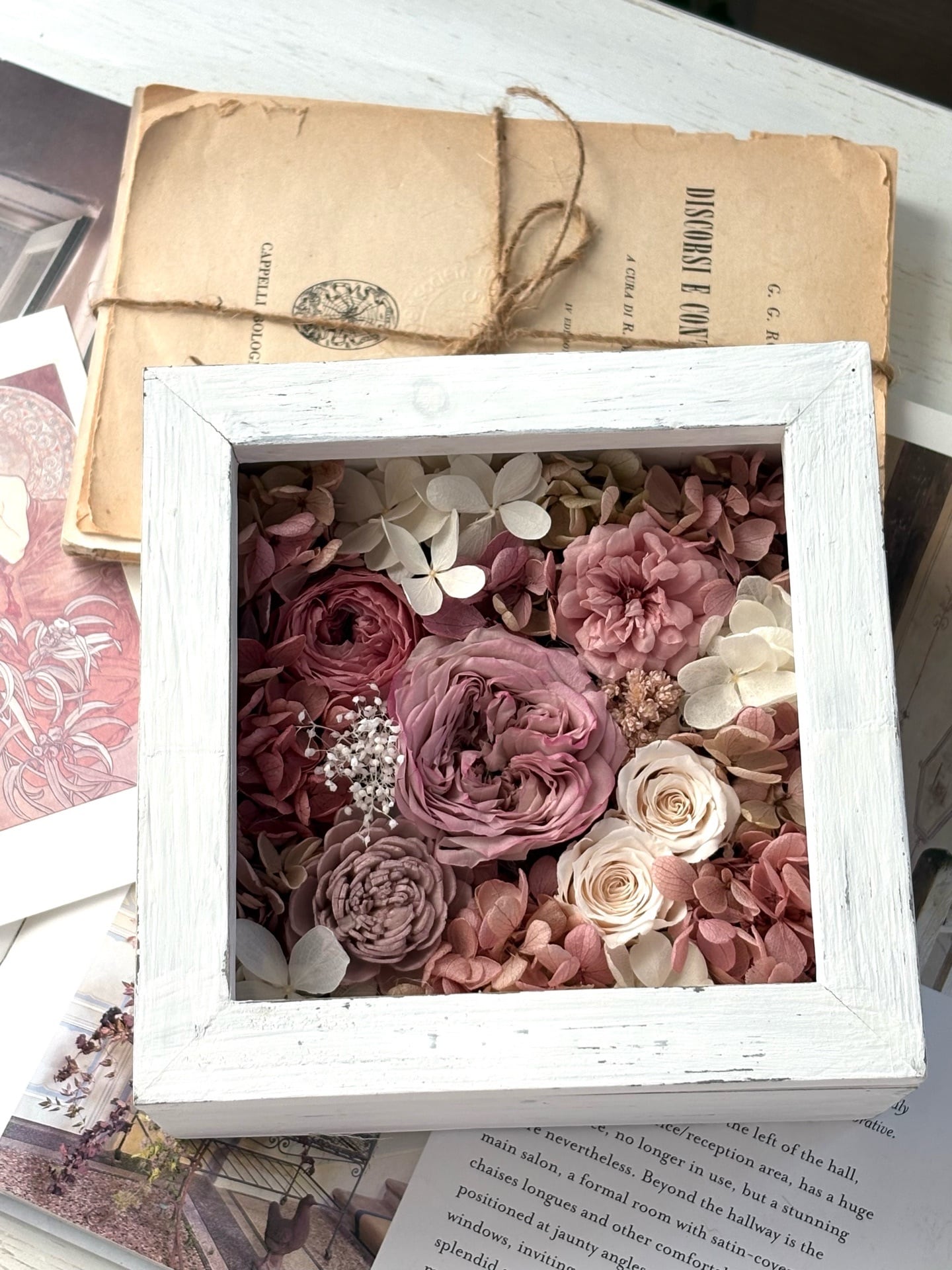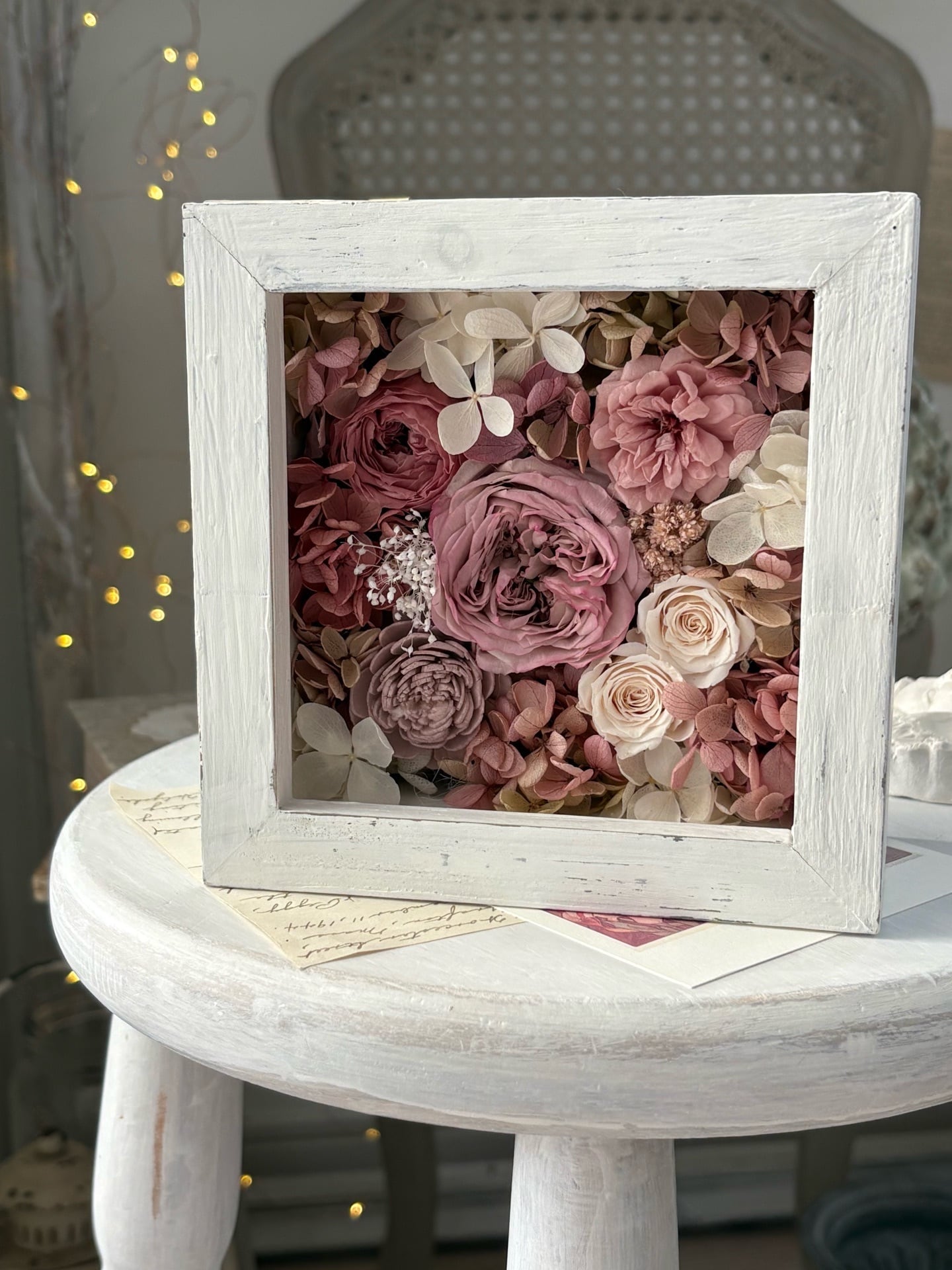 シャビーシックな風合いの白いボックスフレームに、アンティークピンクのバラと紫陽花をアレンジして温かみを感じる色合いのアレンジメントを作りました。
