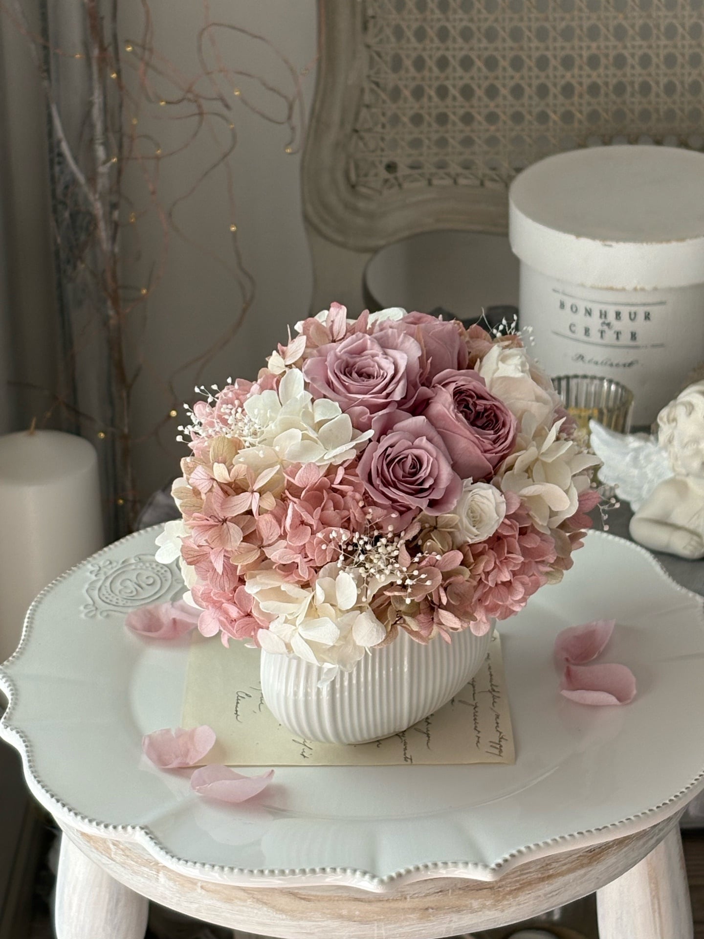コロンとした花姿のオールドローズをメインにピンクとホワイトの紫陽花を添えて、ロマンチックな雰囲気のアレンジメントを作りました。