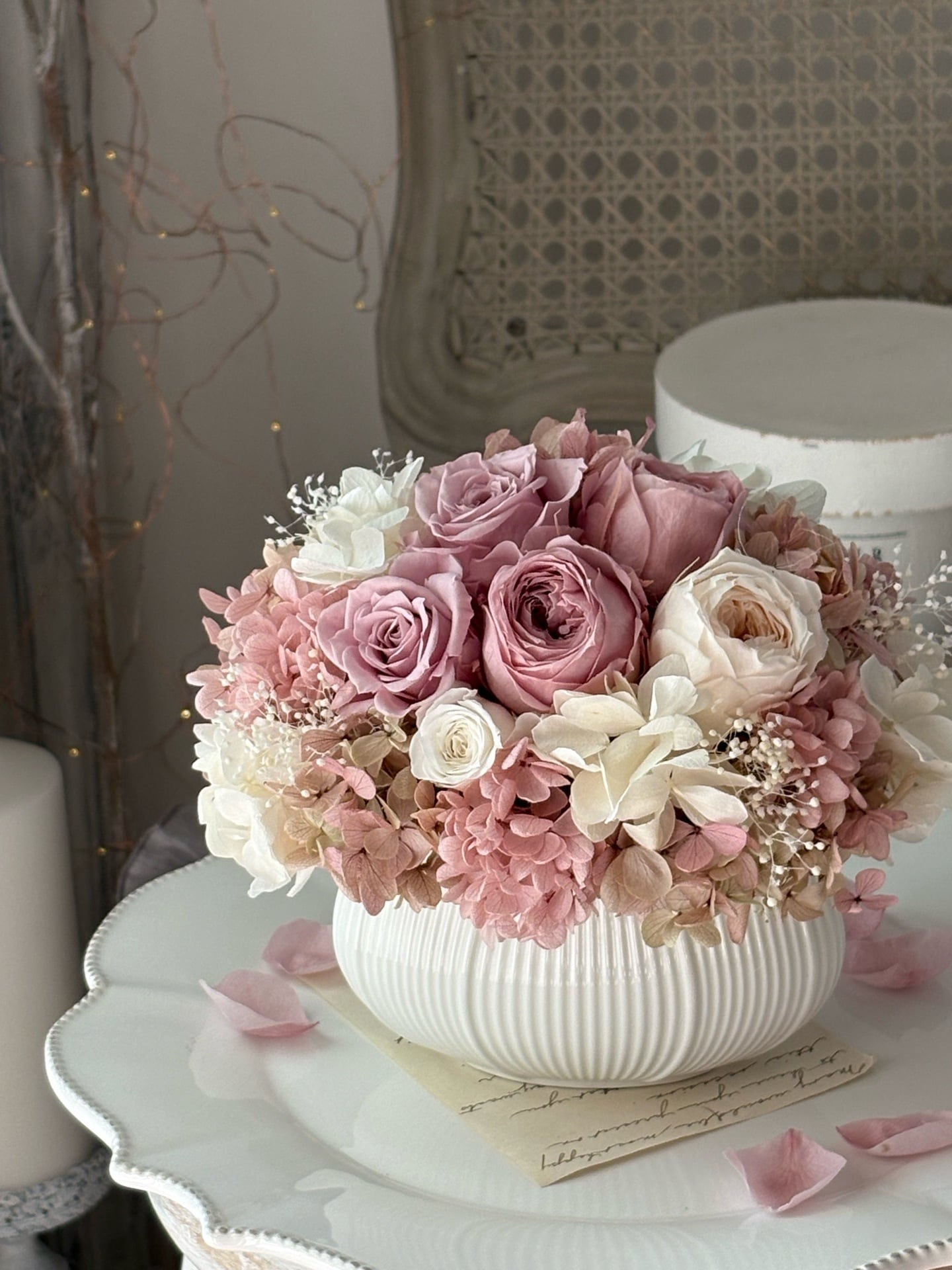 ロマンチックなローズアレンジメント/ミスティーピンク/プリザーブドフラワー/結婚祝い/お誕生日のお花/新居祝い/開店祝い/開業祝い/退職祝い/バースデープレゼント/ラッピング無料【お届け日時指定可能】【沖縄県・離島へのお届け不可】