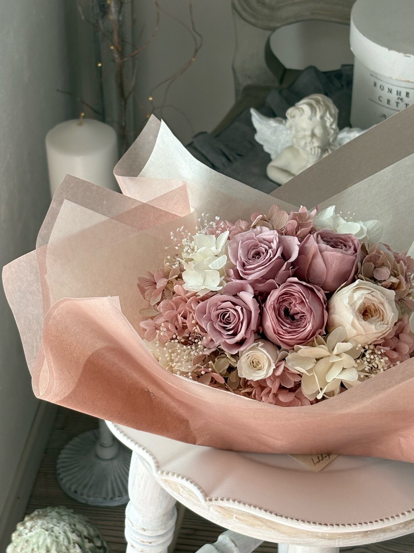 ●スプレーバラ2輪、オールドローズ(小)3輪、ミニバラ1輪、紫陽花3種類、かすみ草など。(プリザーブドフラワー)