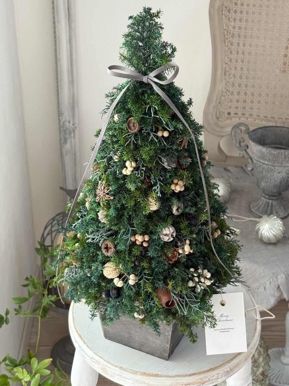 プリザーブドのスギやブルーアイスの葉でツリーを作り、木の実をデコレーションしてシックな雰囲気のクリスマスツリーを作りました。